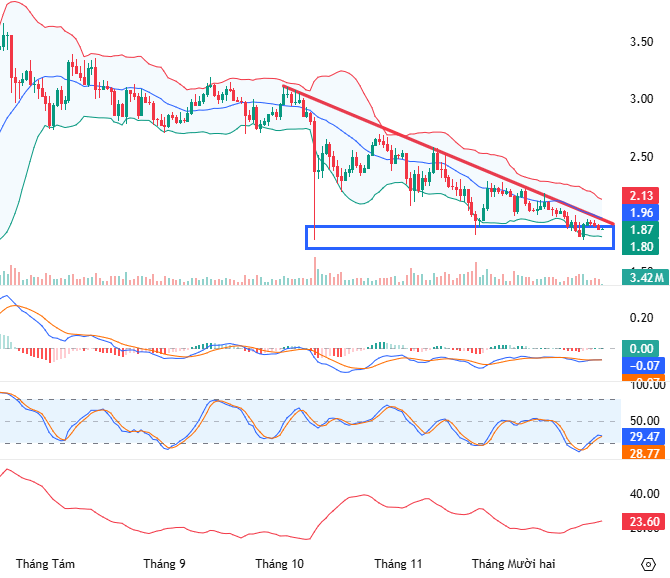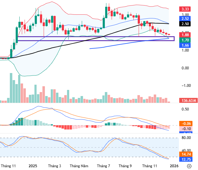 The VN-Index has set a new all-time high (based on closing price), marking its fourth consecutive session of gains while closely tracking the Upper Band of the Bollinger Bands. Both the MACD and Stochastic Oscillator indicators maintain their positive upward trajectory, reinforcing earlier buy signals. The outcome of testing the previous October 2025 peak (around 1,740-1,795 points) will be pivotal in determining the index’s future direction.