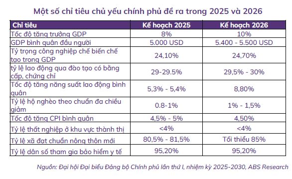 Vietnam has set an ambitious 10% GDP growth target for 2026, exceeding the 7.5-8.5% range planned for 2026-2030. ABS Research forecasts a positive macroeconomic outlook, with GDP growth around 9.5% in the baseline scenario, driven by: