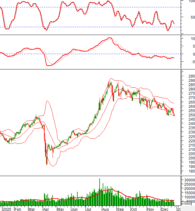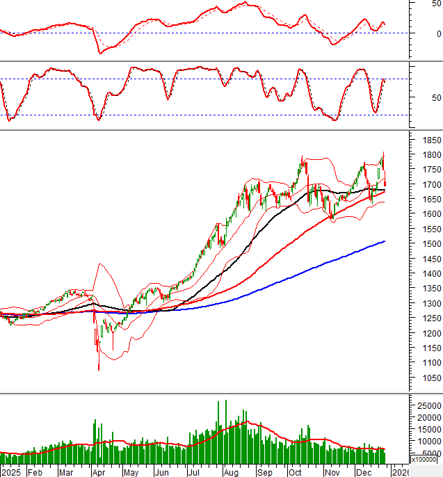 The VN-Index experienced a sharp decline as it retested its October 2025 peak (equivalent to the 1,740-1,795 point range). In the near term, the index is expected to find crucial support from the Middle line of the Bollinger Bands.