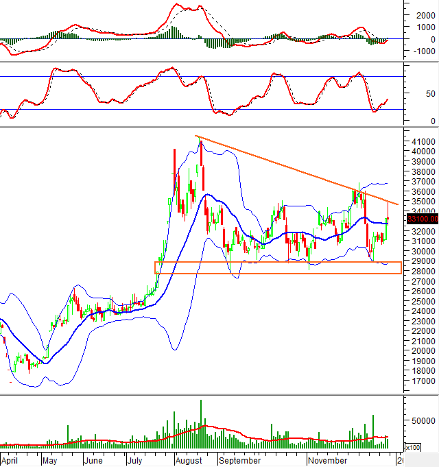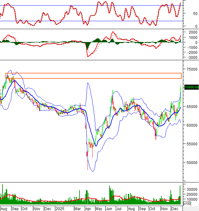 Additionally, the stock price remains close to the Upper Band of the Bollinger Bands, consistently forming higher highs and higher lows (Higher High, Higher Low). The MACD indicator continues to rise after giving a buy signal, further supporting the upward trend.
