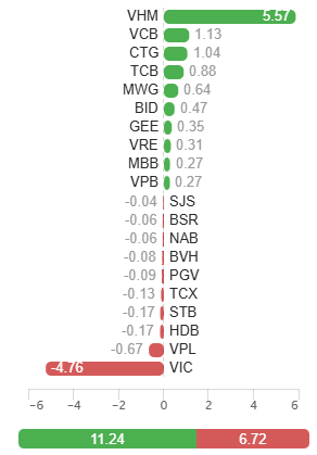 Right at the opening, VHM led the market with a 5.57-point contribution, after the stock gained 4.97%. Following were three banking stocks: VCB (1.13 points), CTG (1.04 points), and TCB (0.88 points). Collectively, the top 10 contributing stocks added 11.24 points, significantly outpacing the top 10 decliners, which shed 6.72 points.