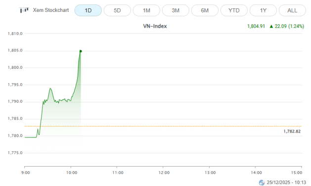 As of 10:10 AM, the VN-Index officially surpassed the 1,800-point milestone, marking a new record high for the Vietnamese stock market.