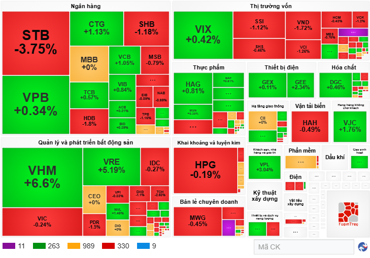 By the end of the morning session, the market map tilted towards red, with 330 declining stocks, including 9 hitting their lower limits, compared to only 274 advancing stocks. The prevalence of red among large-cap groups such as banking, real estate, and securities exacerbated the actual pressure.
