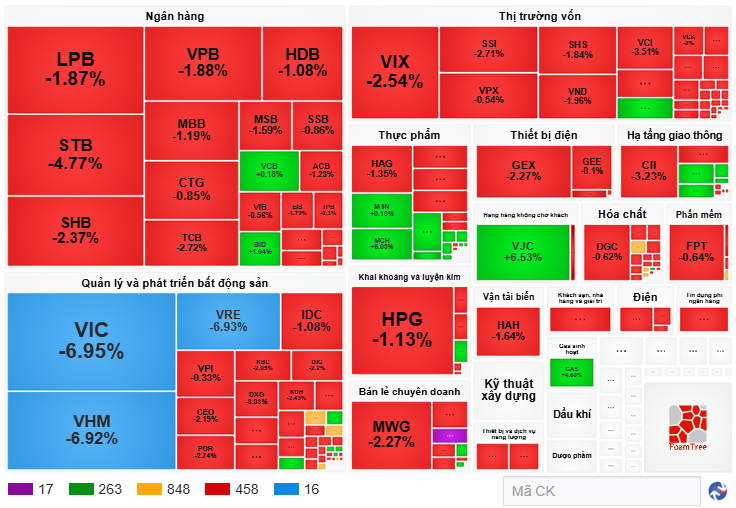 A glance at the market map reveals that red dominated, with 458 declining stocks, including 16 hitting their lower limits, compared to only 280 advancing stocks, and 848 remaining unchanged. Red prevailed in 17 out of 23 sectors according to VS-Sector.