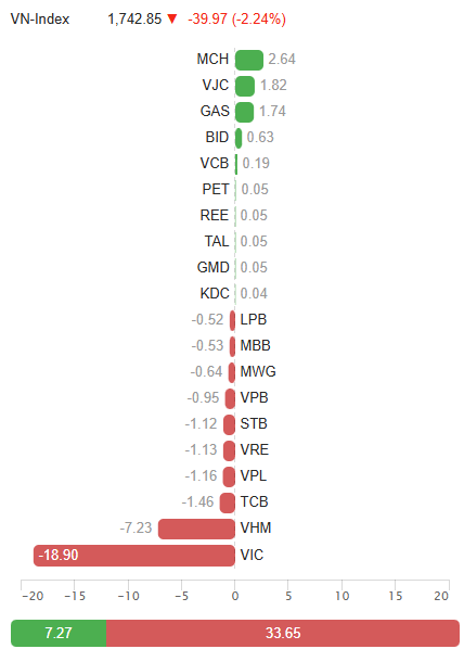 On a positive note, on its first day of listing on the HOSE, MCH impressed with a 5.03% gain, reaching VND 223,500 per share, thereby becoming the stock contributing the most points to the VN-Index, adding 2.64 points.