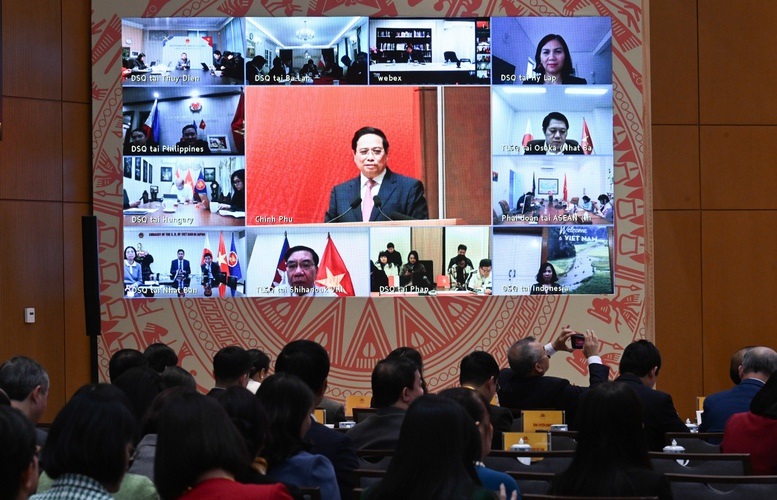 The conference connected online with 98 Vietnamese representative agencies abroad – Photo: VGP/Nhat Bac