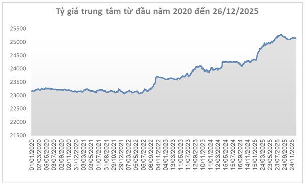 Domestically, the USD/VND exchange rate mirrored the dollar’s weakening trend on the international market. On December 26, the State Bank of Vietnam set the central rate at 25,133 VND/USD, a 15-dong decrease from the previous week’s close.