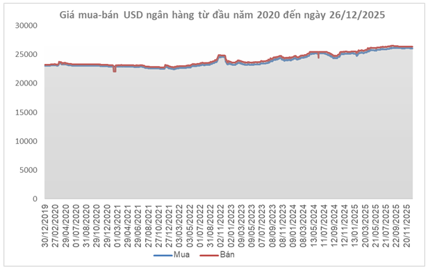 UOB Bank forecasts the USD/VND exchange rate at 26,300 in Q1/2026, 26,100 in Q2/2026, 26,000 in Q3/2026, and 25,900 in Q4/2026. For gold, UOB has revised its price predictions to $4,300/oz in Q1/2026, $4,400/oz in Q2/2026, $4,500/oz in Q3/2026, and $4,600/oz in Q4/2026.
