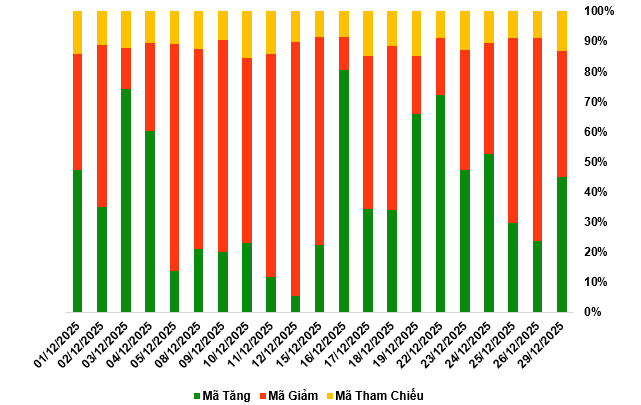 During the December 29, 2025 session, the market exhibited mixed movements, with buyers gaining a slight edge, leading to price increases in most warrant codes. Notably, the top gainers included CSTB2515, CVHM2516, CMWG2511, and CMBB2511.