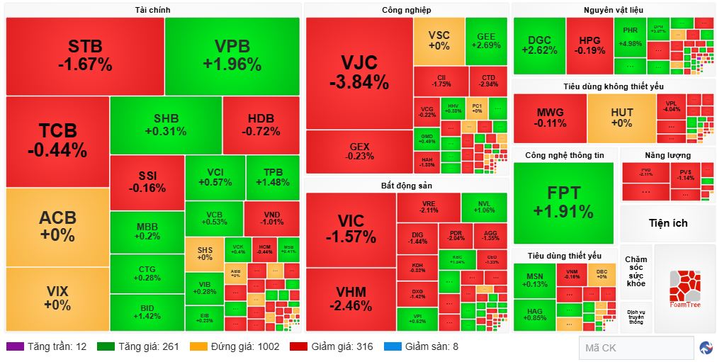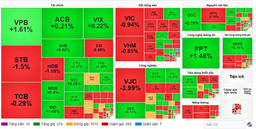 The financial sector demonstrated positive momentum early on, with widespread gains of around 1%. Banks, in particular, contributed significantly to the index’s rise, led by TCB, VPB, MBB, and STB.