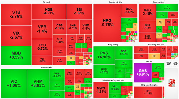 Conversely, the financial sector saw a significant decline of 1.38%, mainly due to VIX (-6.67%), SSI (-3.64%), HDB (-2.53%), and VPB (-2.62%).