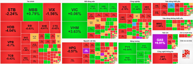 The financial sector faced strong selling pressure, with major players like STB down 2.59%, HDB down 4.04%, VIX down 2%, SSI down 1.16%, and VND down 1.03%…