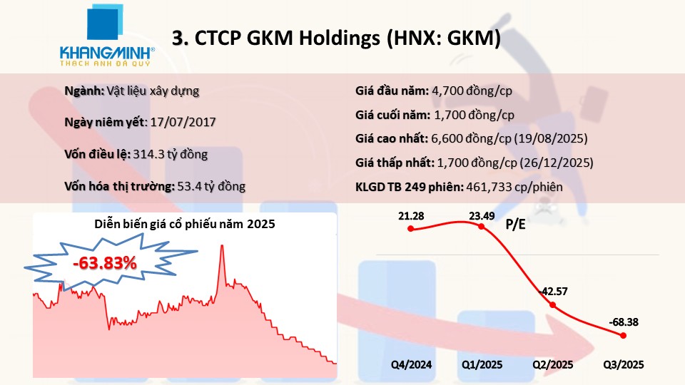 GKM fell nearly 64% in 2025, ending at 1,700 VND per share, its yearly low. Notably, GKM had formed a “Christmas tree” pattern in August, peaking at 7,000 VND per share. |