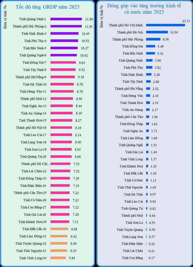 According to the statistical agency, amidst the country’s impressive 8.02% GDP growth in 2025, local GRDP growth generally followed the national economic trend, continuing its recovery and expansion. However, growth rates varied across regions.