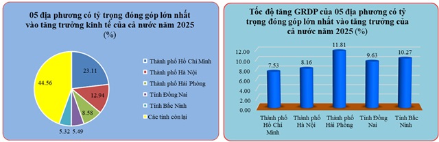 Alongside the high-growth localities, Hanoi, Ho Chi Minh City, Hai Phong, Dong Nai, and Bac Ninh remain the pillars of the national economy, contributing the most to overall GDP growth. These five localities, with the largest economies in the country, accounted for 55.4% of national growth in 2025.