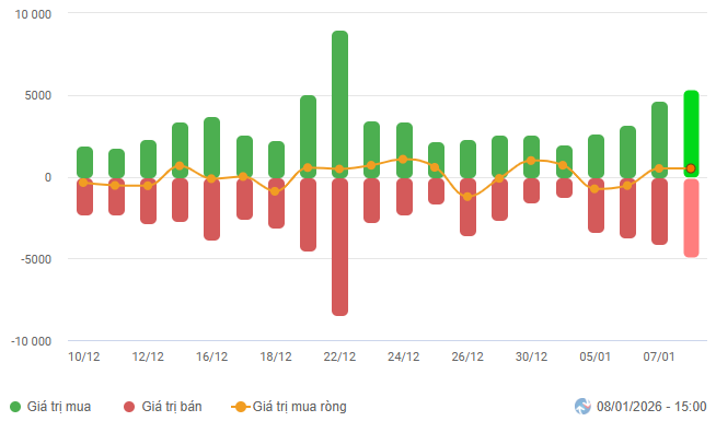 – The market corrected on January 8th, characterized by divergence. Early enthusiasm propelled the VN-Index close to 1,890 points, but the rally stalled as leading stocks cooled after a strong run, and investors became more selective. This led to a tug-of-war with persistent fluctuations around 1,870 points for most of the session. Late-session profit-taking pressure intensified, pushing the index into negative territory just before the ATC session, particularly due to the reversal of Vingroup stocks. The VN-Index closed down 6 points at 1,855.56.