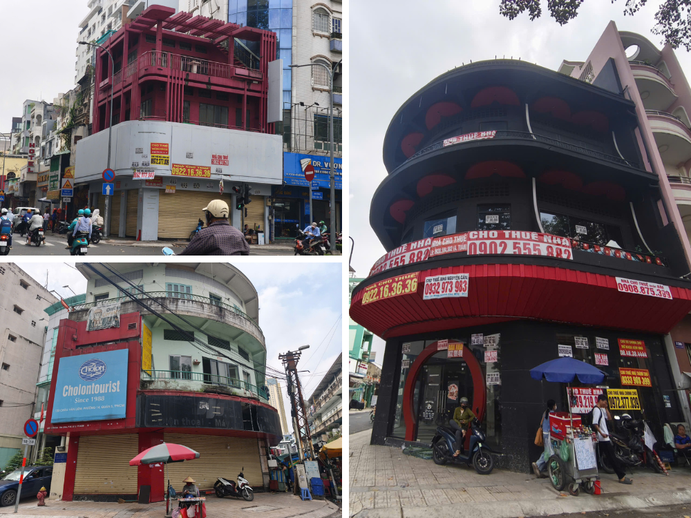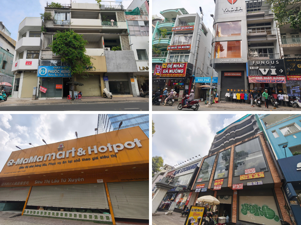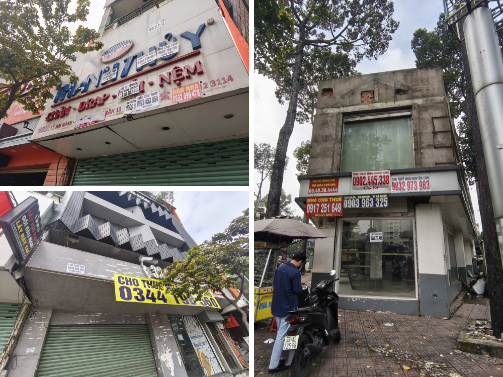 Along Nguyen Trai Street, it’s common to see large vacant storefronts and corner buildings with “For Lease” signs plastered everywhere. Photo: Thuong Ngoc |