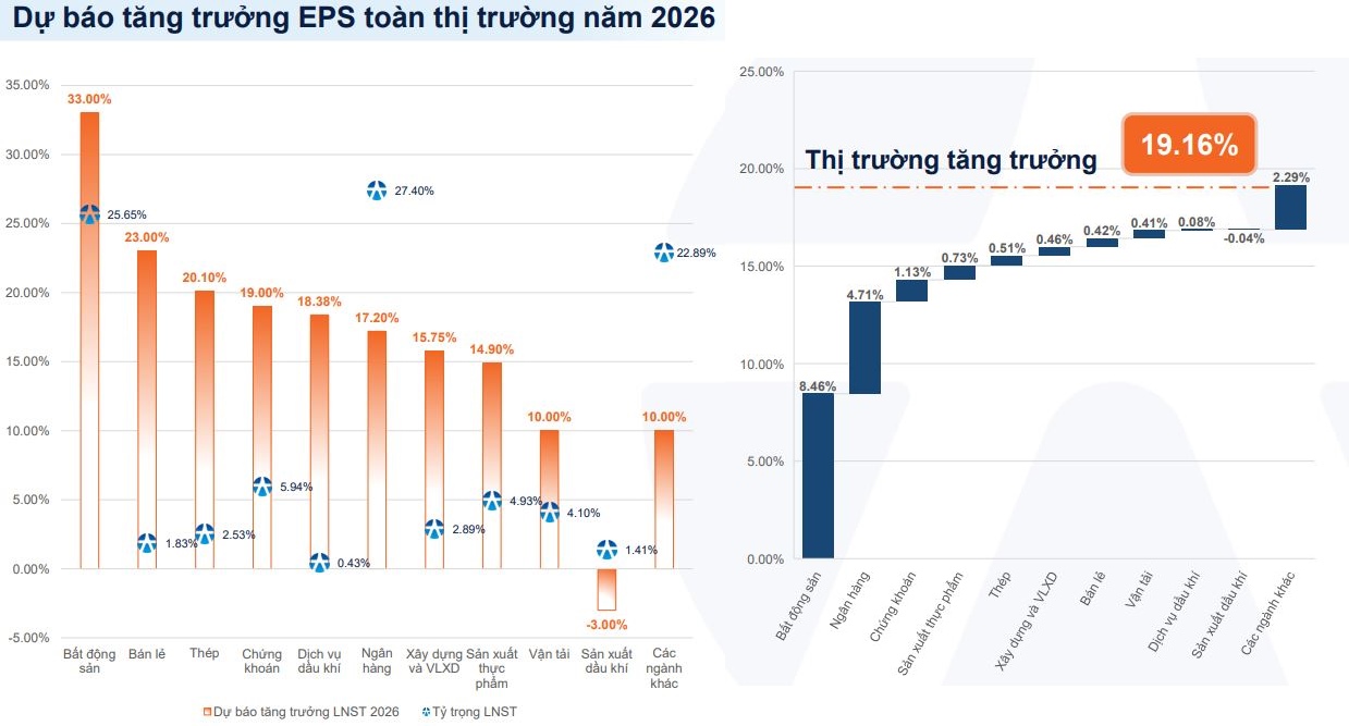 In Scenario 1 (67% probability), the VN-Index remains in a long-term Wave 3 uptrend, targeting 2,280 points. Growth will be broadly distributed across stock groups, with the strongest momentum in large-cap VN30 stocks, driven by growth convergence and low valuations. The narrative of market upgrades, coupled with a strong macroeconomic foundation, will fuel the market in 2026. Yuanta considers this scenario highly likely.