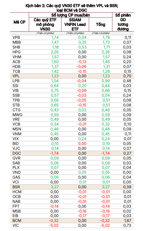 In this case, ETFs would heavily buy BSR, HPG, and VPL (3.2 million, 2.2 million, and 1.2 million shares, respectively), while selling VIC, DGC, and BCM (5 million, 1.7 million, and 315,000 shares, respectively).