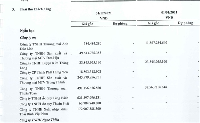 Ngoc Thien Global’s receivables are concentrated in companies such as: Tung Bach Battery Limited Liability Company (nearly 622 billion VND), Thuan Toan Trading Limited Liability Company (491 billion VND), Trung Thanh Manufacturing and Trading Private Enterprise (246 billion VND), and Thai Binh Vietnam Import-Export Limited Liability Company (173 billion VND). These companies are newly established and/or share similar addresses.