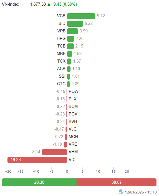 – Continuing the upward momentum from the previous week, the market remained vibrant on January 12. From the opening session, widespread buying pressure across various sectors quickly propelled the VN-Index to nearly touch the 1,890-point mark within just over half an hour. Although the upward trend later narrowed significantly due to counter-pressure from Vingroup’s major stocks, the overall market sentiment remained positive, with a dominant breadth favoring gains. Liquidity was notably concentrated in the securities and banking sectors. The index maintained its green hue until the end of the session, closing at 1,877.33 points, a 0.5% increase from the previous session.