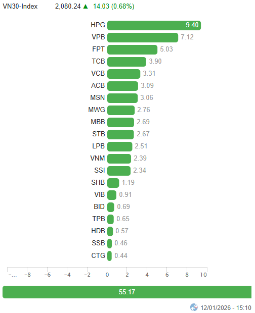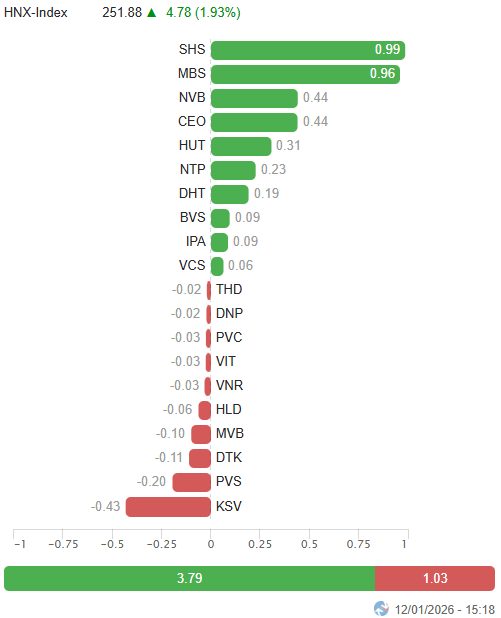 – Major indices unanimously rose during the January 12 trading session. The VN-Index increased by 0.5%, reaching 1,877.33 points, while the HNX-Index surged by 1.93%, closing at 251.88 points.