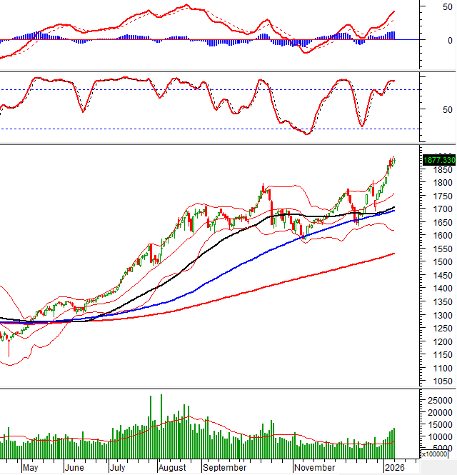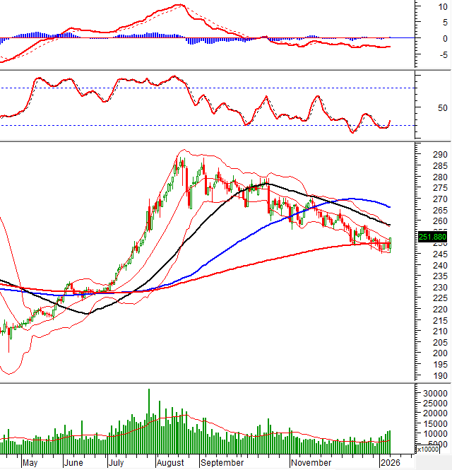 The HNX-Index rebounded strongly, crossing above the Middle line of the Bollinger Bands. Trading volume continued to rise and remained above the 20-day average, indicating improving investor sentiment.