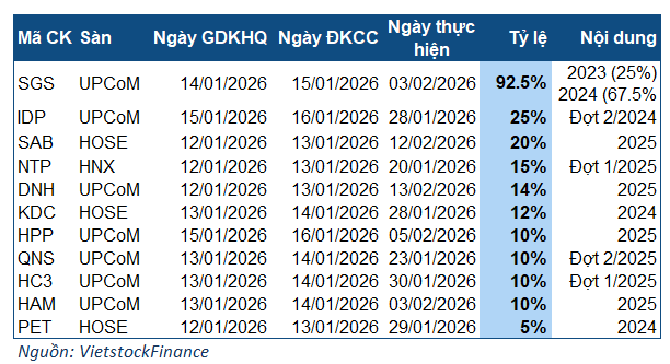 Next in line is the dairy company IDP, announcing a 25% dividend payout (2,500 VND per share). The total payout amounts to 154.5 billion VND, primarily benefiting major shareholders: Bluepoint Corporation (54.29%), Vietcap Securities – VCI (15%), and Daytona Investments Pte. Ltd. (12.56%). The ex-dividend date is January 15, with payment scheduled for January 28.