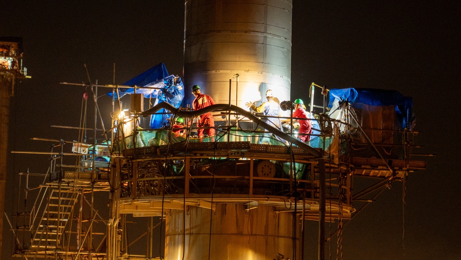 By nearly 6 PM, the crane lifted the catalyst basket out of the storage shell.