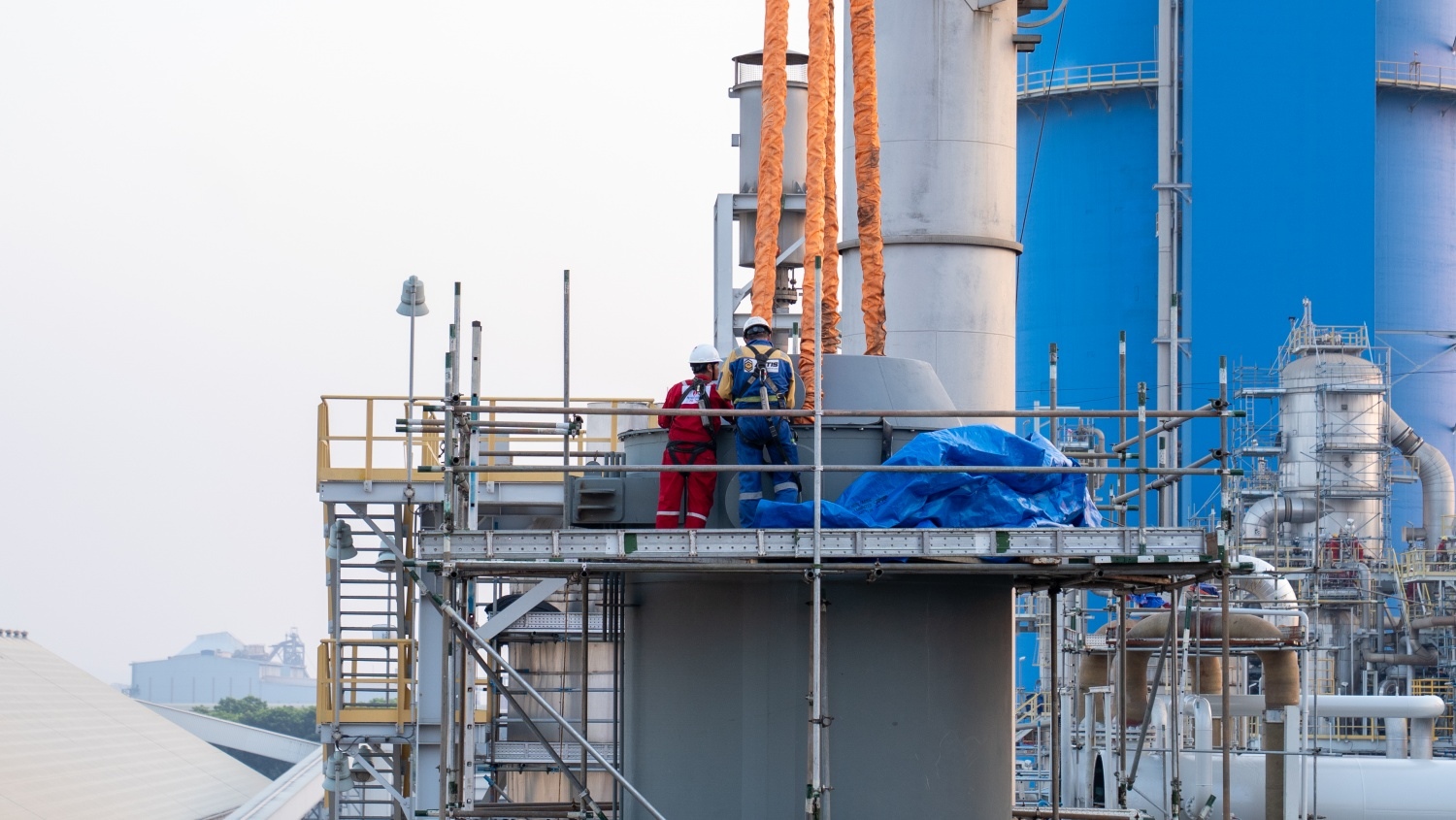 ![]() The crane cables were securely attached to the catalyst basket, ready to lift it from the storage shell.