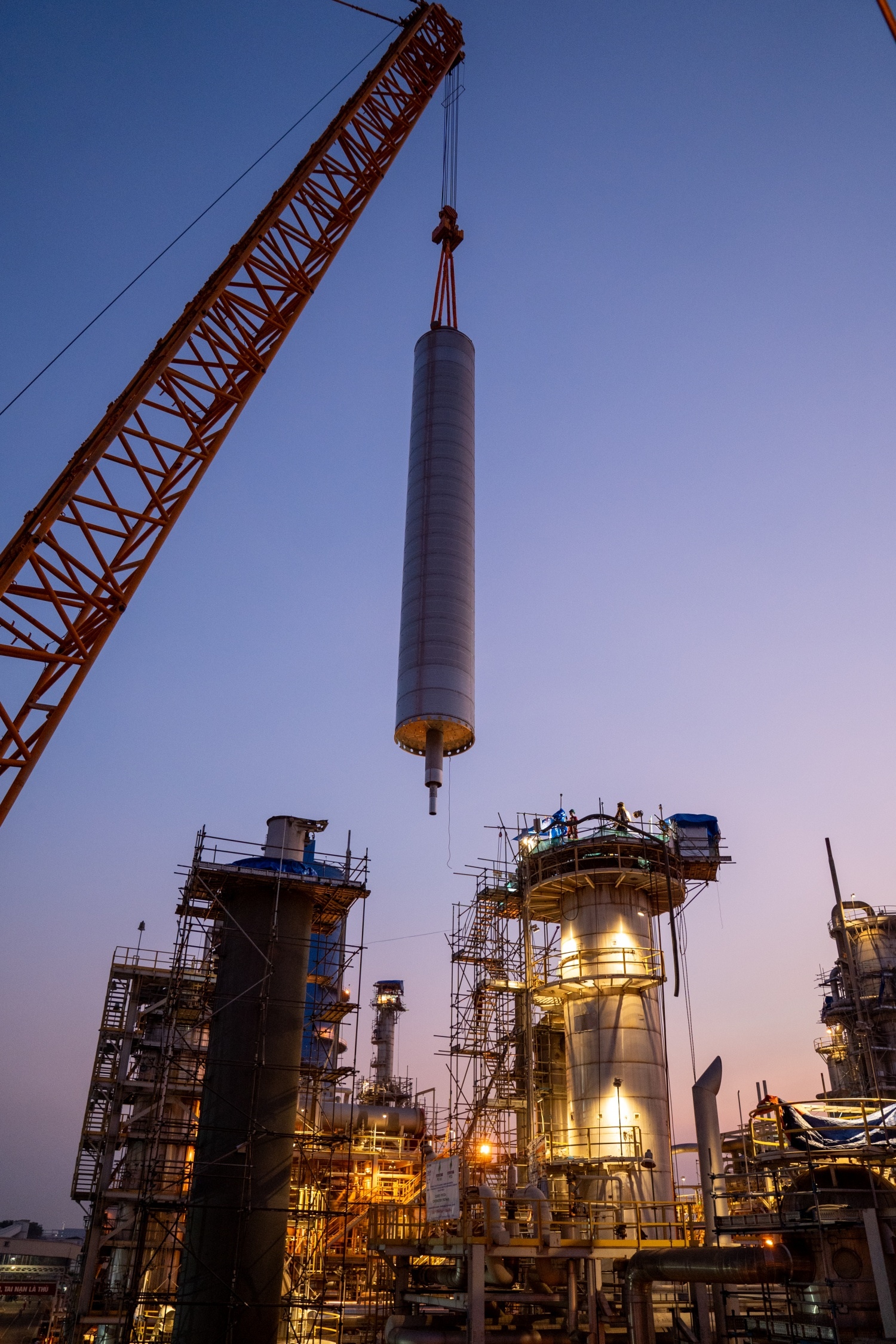 To facilitate the catalyst basket replacement, Phú Mỹ Fertilizer Plant deployed two cranes with lifting capacities of 1,250 tons and 225 tons, coordinating to handle components weighing up to 105 tons. Depending on the position and height, the cranes were strategically calculated and load-distributed to ensure safety and precision throughout the installation process.
