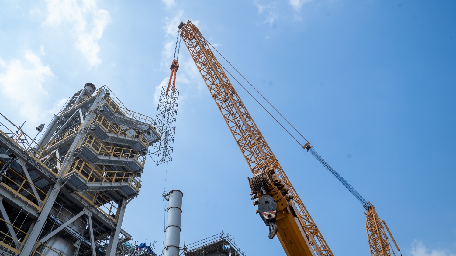 ![]() The crane cables were securely attached to the catalyst basket, ready to lift it from the storage shell.