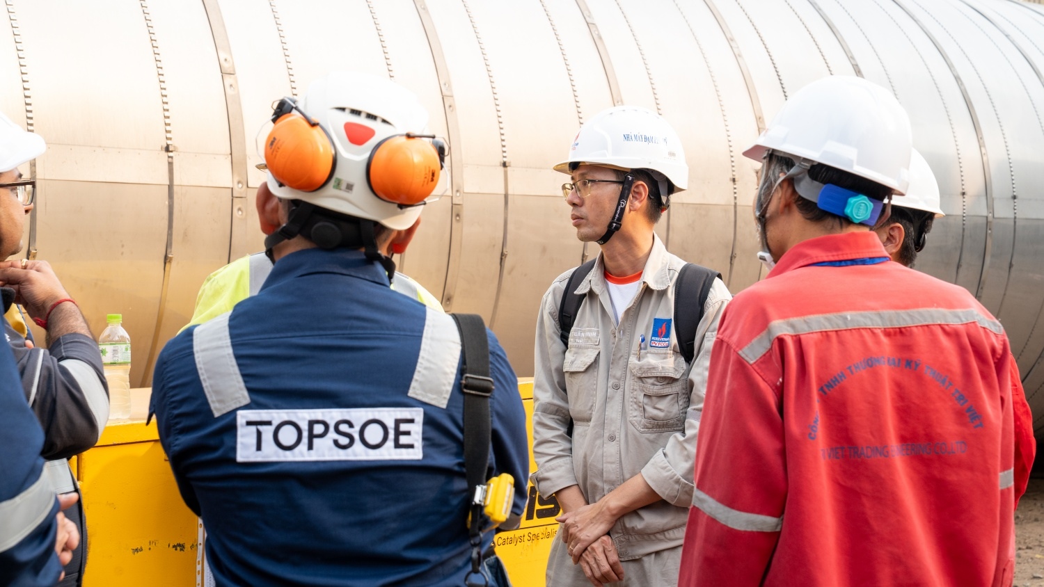 Mr. Hoàng Tuấn Minh (gray shirt), Foreman of the Ammonia Workshop (Phú Mỹ Fertilizer Plant), explained that the catalyst basket would be lifted from the storage shell into the equipment shell for a trial fit. This process gathers data on the gap between the basket’s bottom and the internal support. Afterward, the basket is lifted again to weld spacer plates, ensuring uniform gaps and aligning the basket vertically and concentrically as per technical requirements.