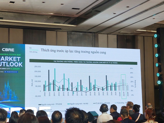 At the Vietnam Real Estate Market Outlook 2026 event on January 13th, Mr. Lê Trọng Hiếu, Senior Director and Head of Leasing at CBRE Vietnam, revealed that in 2025, Ho Chi Minh City (HCMC) will welcome approximately 80,000 sqm of new office supply, while absorption is expected to reach only around 40,000 sqm. Notably, the vacancy rate in Grade A offices has risen to about 18%.