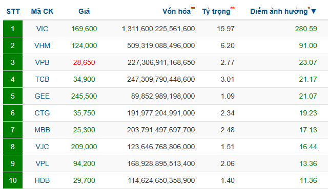 Top 10 Stocks with the Most Positive Impact on VN-Index in 2025 – Source: VietstockFinance