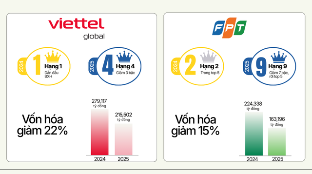 FPT Corporation (HOSE: FPT) also recorded a 15% capitalization decline, falling from the second position in 2024 to ninth in 2025. This shift reflects the challenges in maintaining high growth rates at a large scale, amidst slowing global IT spending and more cautious international investment plans and digital transformation project implementations.