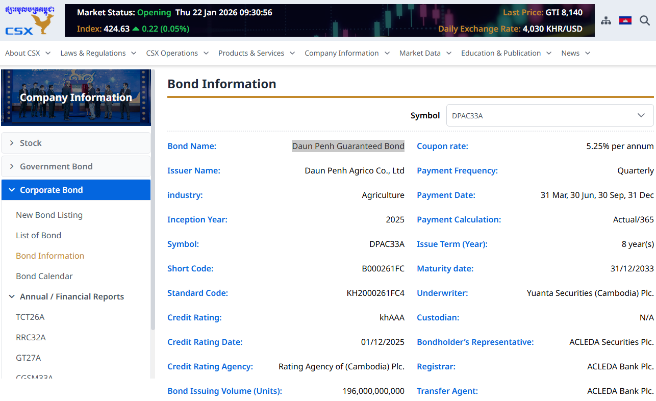 Details of Thaco Agri’s Cambodian bond tranche – Screenshot from CSX.