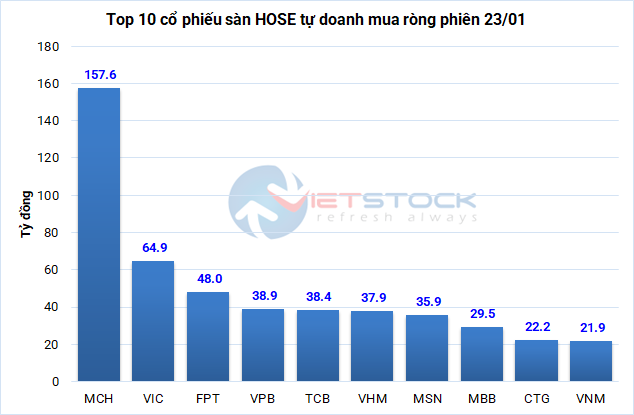 On the buying side, a rare highlight was MCH, which saw proprietary desks accumulate a net VND 158 billion, far exceeding VIC in second place with VND 65 billion and FPT with VND 48 billion.