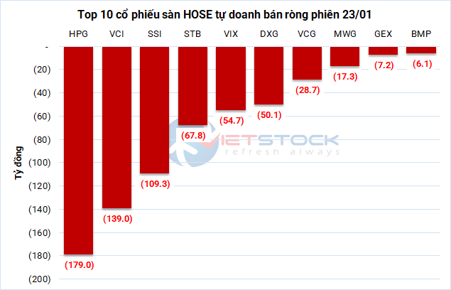 In contrast to foreign investors, proprietary trading desks recorded a slight net selling of nearly VND 42 billion on the HOSE. Notably, selling pressure was heaviest on HPG, with VND 179 billion, dominating the rest. Securities stocks also faced significant selling pressure, with VCI and SSI seeing net selling of VND 139 billion and VND 109 billion, respectively; VIX also featured among the top 10 most heavily sold stocks.