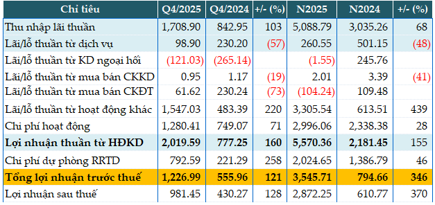 Total assets as of year-end 2025 increased by 25% compared to the beginning of the year, reaching VND 220,462 billion. Customer loans grew by 15% to VND 113,891 billion, while customer deposits surged by 47% to VND 133,411 billion.