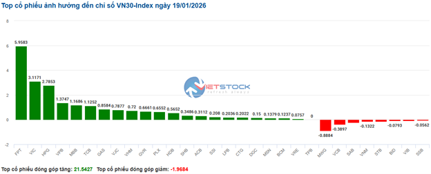 | Top 10 stocks impacting the VN-Index on January 19, 2026 (in points) |