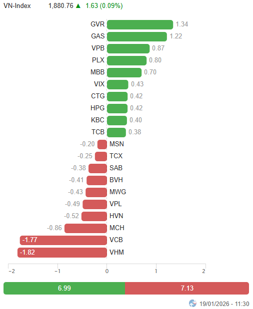 At the start of the session on January 19, as of 9:30 AM, the VN-Index fluctuated after a slight increase, trading around 1,885 points. The HNX-Index saw a slight increase, holding at 253 points.