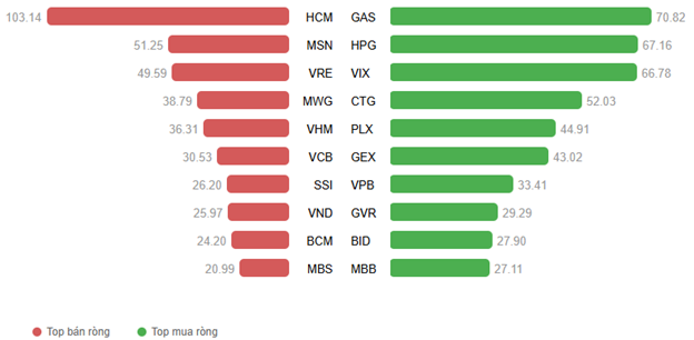 Foreign investors continued net selling, with a value of nearly 34 billion VND across all three exchanges. Selling pressure was concentrated on the HCM exchange, with a value of 103.13 billion VND. Leading the net buying were GAS, HPG, and VIX, with values ranging from 66 to 71 billion VND.