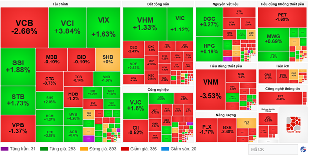 Leading the recovery was the real estate sector, which experienced strong divergence, with green concentrated in large-cap stocks like VHM (+5.81%), VIC (+3.48%), and VRE (+3.14%).