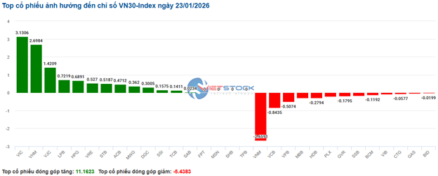 | Top 10 stocks most impacting the VN-Index on January 23, 2026 (measured in points) |