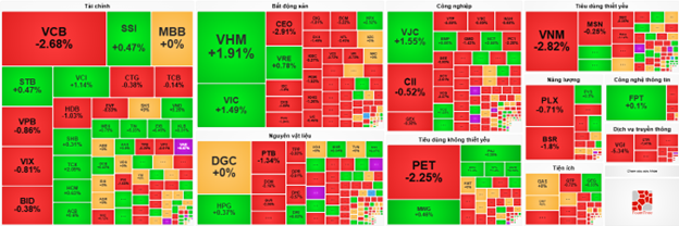 Leading the recovery was the real estate sector, which experienced strong divergence, with green concentrated in large-cap stocks like VHM (+5.81%), VIC (+3.48%), and VRE (+3.14%).