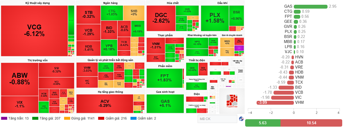 Overall, buying pressure remained dominant today, with 380 stocks rising and nearly 340 falling. The main pressure came from the sharp decline of many large-cap stocks. VHM hit the floor, while VIC dropped by 5.6%. VCG also plummeted to the floor. ACV fell by 6.6%. Additionally, some bank stocks like TCB and EIB saw declines. The top 10 stocks dragging the market down accounted for nearly 25 points.