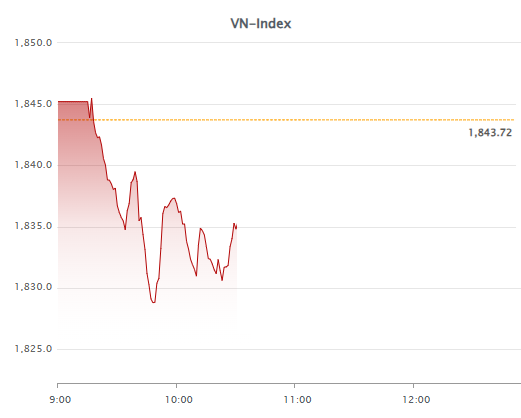 Each rebound was met with strong resistance, leaving the VN-Index at 1,834.84 by 10:30 AM, down 8.88 points. Meanwhile, the HNX-Index and UPCoM-Index remained in the green, up 1.07 and 0.57 points, respectively.