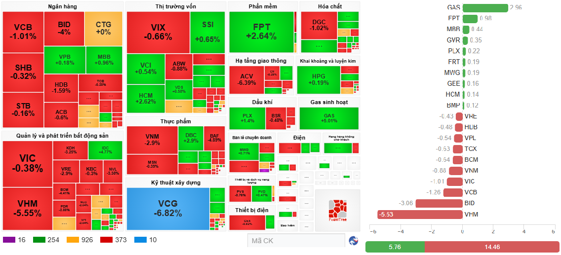 The market landscape mirrored the morning session, with red dominating large-cap sectors like banking and real estate. Stocks like ACV, DGC, and VCG continued to underperform, with VCG hitting the floor.