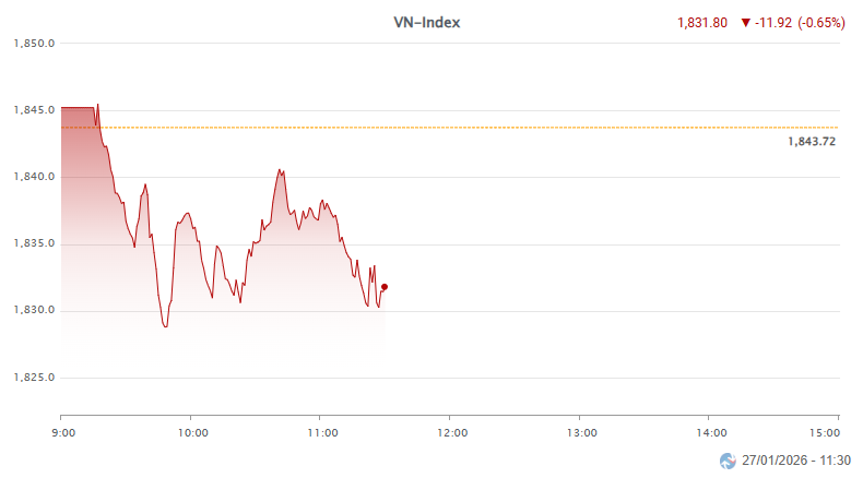 By the end of the morning session, the VN-Index closed in the red, down 11.92 points to 1,831.8, amid significant pressure. Meanwhile, the HNX-Index rose 1.14 points to 248.44, and the UPCoM-Index gained 0.39 points to 126.95.